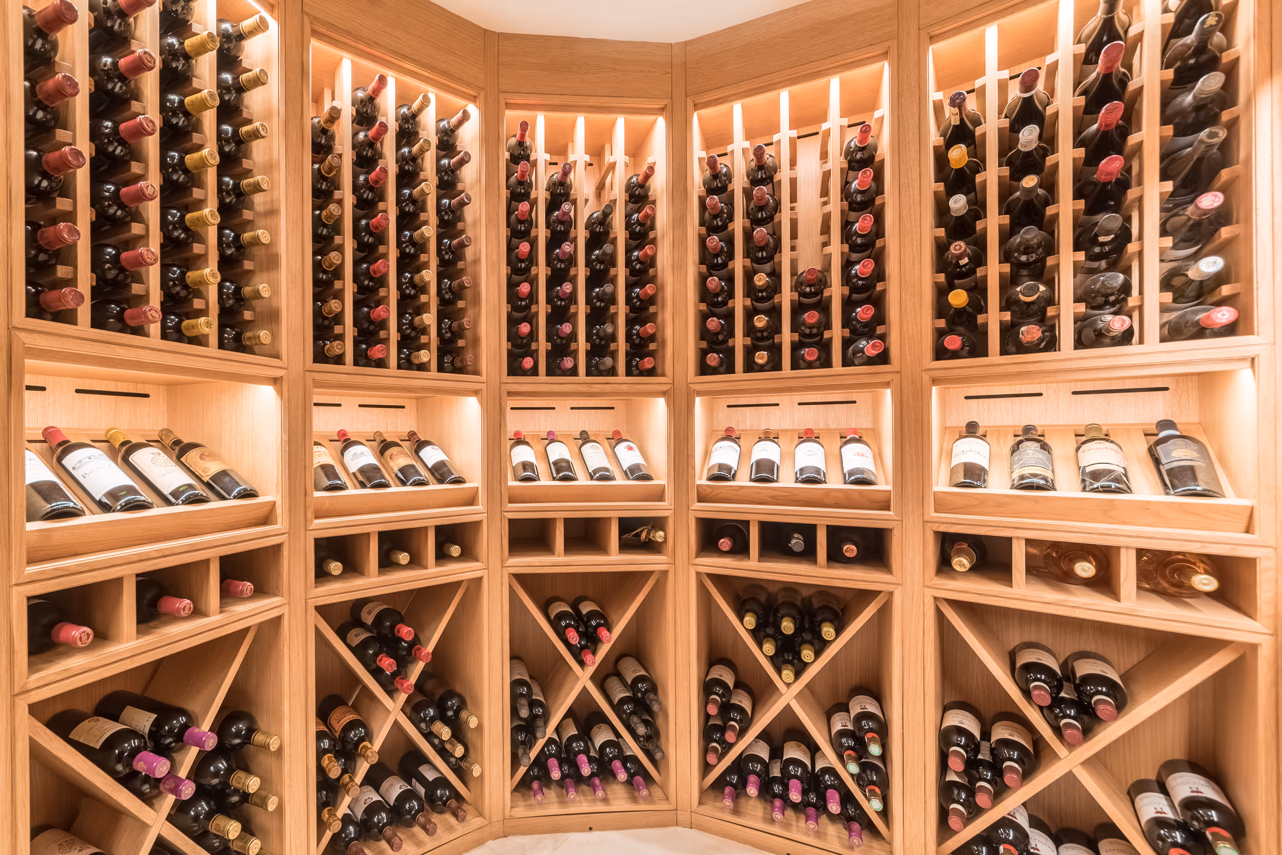 Traditional spiral cellar that curves beautifully around a small subterranean space, as well as under the stairs. Natural oak construction.