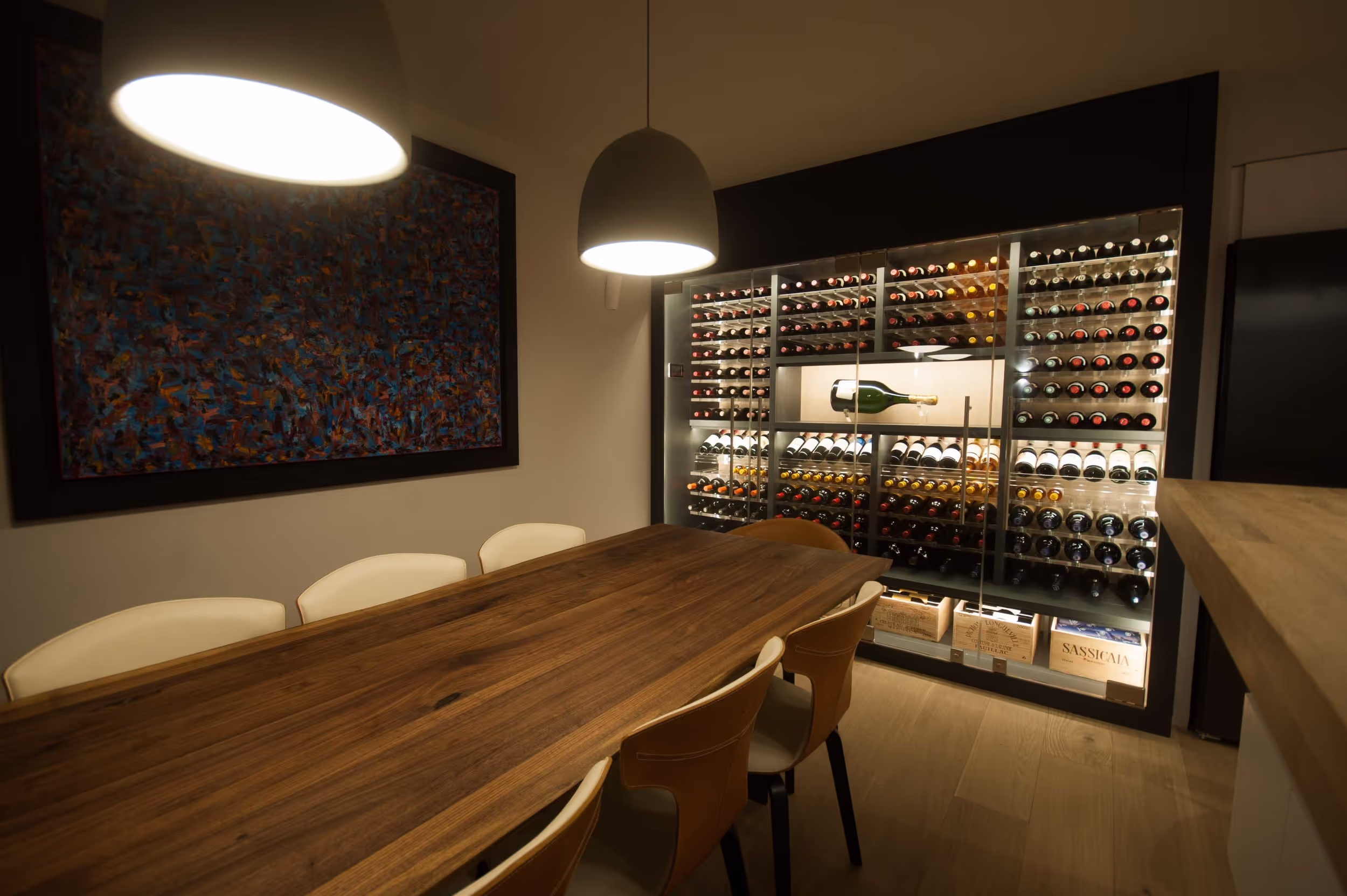 Wine bottles are elegantly cellared on thick polished acrylic glass shelves, both horizontal and angled display, with a large format feature bottle. Chocolate brown oak joinery and frameless glass doors.