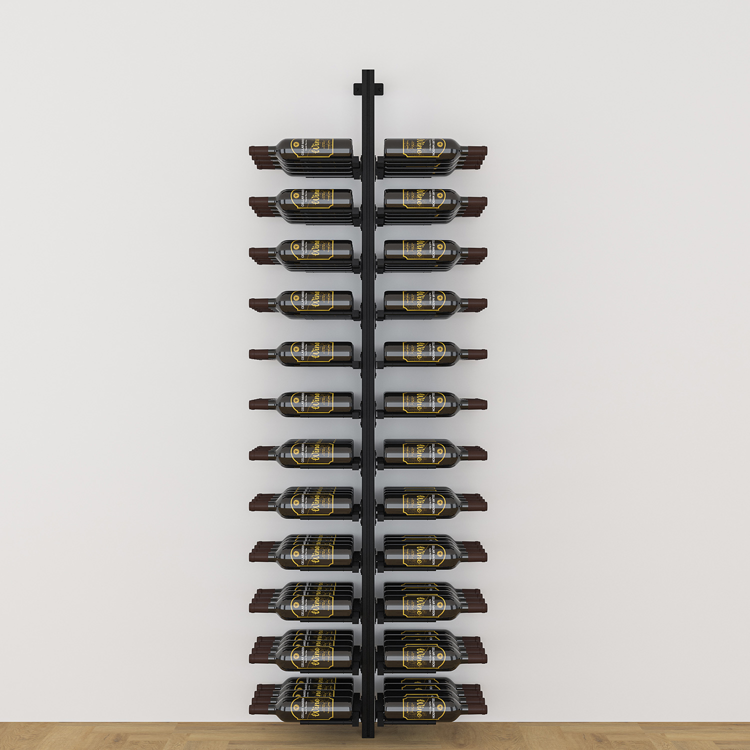DISPLAY Series, wall bottle display set. ‘Label-out’ arrangement, 96 bottle capacity. Durable matte black powder coated finish. Bottle pegs with inset silicone rings to protect bottle labels. Shelves height adjustable. Easy to install. Customisation is available.