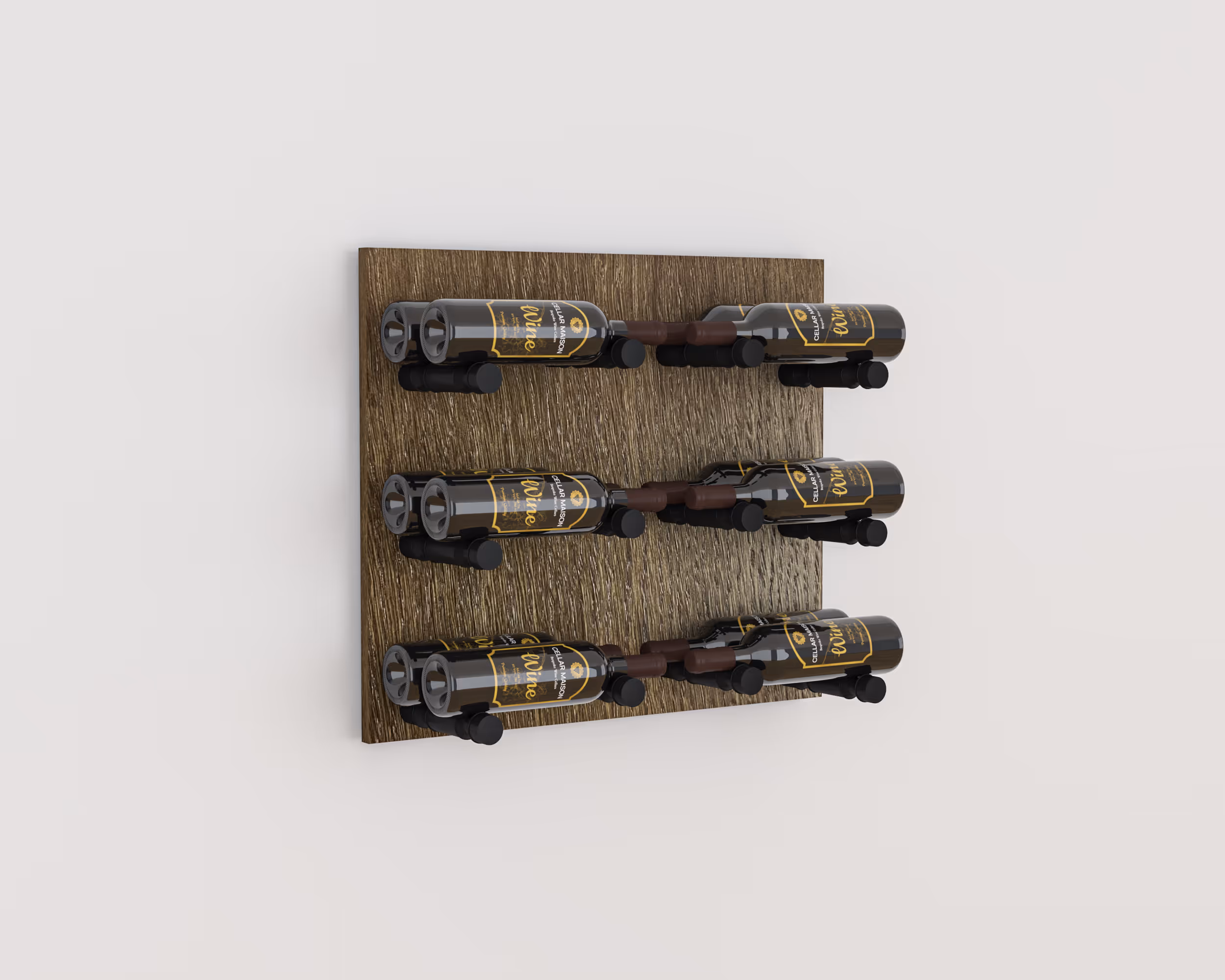 Wall mounted Natural oak veneer or spray painted panel intended to store 12no. standard 750ml bottles ‘label-out’ lying horizontally (2no. bottles deep, i.e. one behind the other). Bottles rest on 18mm diameter matte black aluminium pegs with silicone ring inserts to protect bottle labels. Please select your panel colour/finish in the dropdown menu. Note, some bottle shapes will sit slightly differently to others.