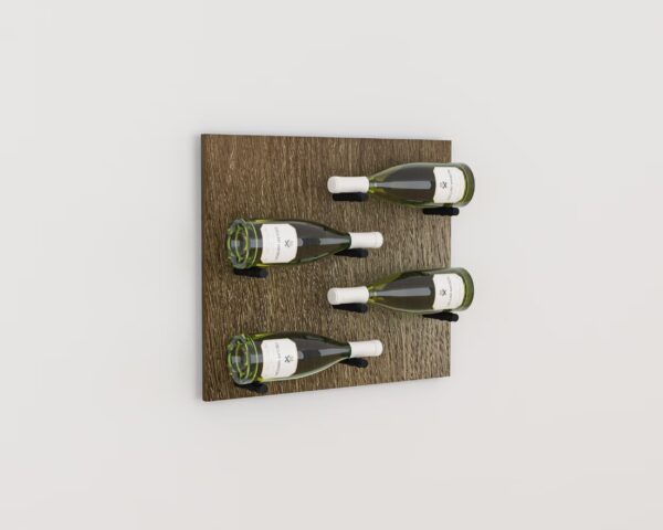 Wall mounted Natural oak veneer or spray painted panel intended to store 4 Magnum 1.5 Litre bottles ‘label-out’ lying horizontally. Bottles rest on 18mm diameter matte black aluminium pegs with silicone ring inserts to protect bottle labels. Please select your panel colour/finish in the dropdown menu. Note, some bottle shapes will sit slightly differently to others.